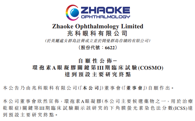 近日兆科眼科 $06622.HK 宣布,该公司主要候选药物之一、用于治疗干眼症的环孢素A眼凝胶,在关键3期临床试验中达到预设主要研究终点。对比安慰剂治疗,接受环孢素A眼凝胶(0.05%,q.d.)的患者在病情改善上具有显著统计学差异及临床意义。目标是于2021年底前向中国国家药品监督管理局(NMPA)提交新药上市申请。