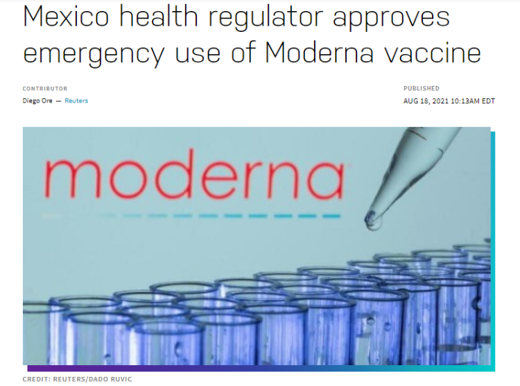8月18日路透社消息,墨西哥卫生监管机构 Cofepris 周三表示,已授权 Moderna $MRNA 的 COVID-19 疫苗紧急使用。监管机构在声明中表示,Moderna 是 Cofepris 授权在墨西哥紧急使用的八种疫苗之一。