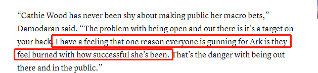“Cathie Wood从不羞于公开她的宏观投资策略,”Damodaran表示,“对外开放的问题是这会成为你背后的靶子。我觉得每个人都在围剿Wood的原因之一就是他们对她的成功感到愤怒,这就是摆在公众面前的危险。”