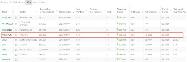 本周早些时候披露的一份监管文件显示,“大空头”利用看跌期权做空Ark Innovation ETF。当标的证券股价下跌时,投资者从看跌期权中获利。据《华尔街日报》报导,今年第二季度,其他多家对冲基金建立了针对ARK创新ETF的新空头头寸。