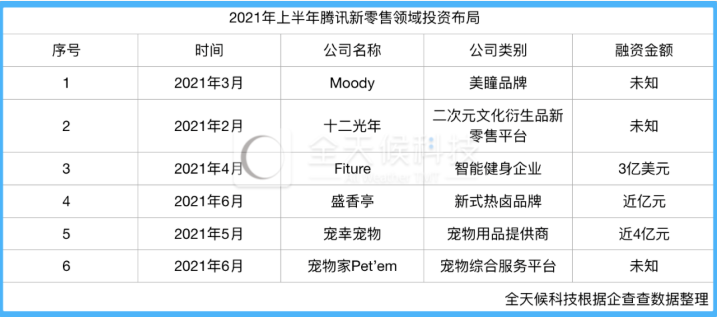 根据企查查的数据,截至2021年7月22日的上半年,腾讯在新消费领域的投资事件共6起;特别是在二季度,新消费更受腾讯偏爱,包括宠物、轻餐、二次元衍生品零售等细分赛道均获得其青睐。