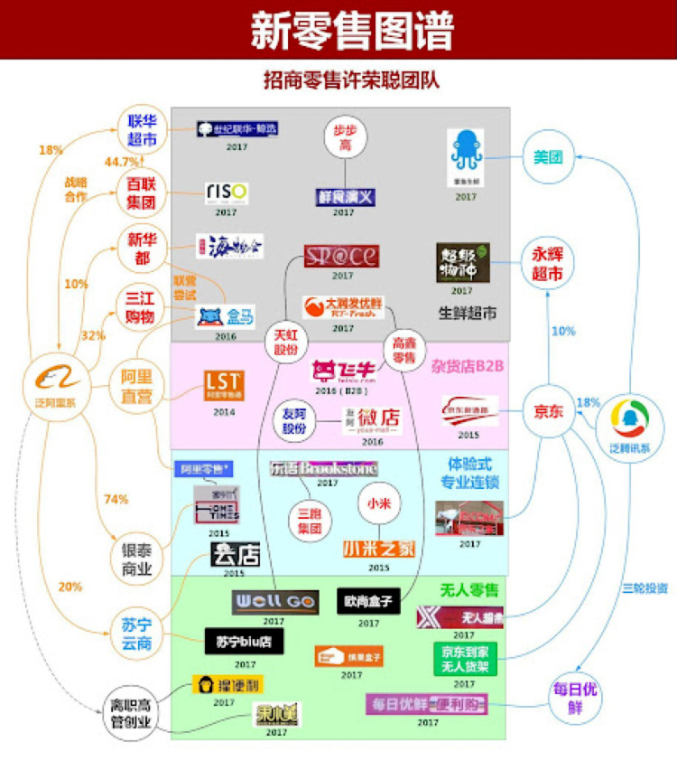 2018年,招商证券发布的一份阿里、腾讯新零售图谱可以看到,两家企业在投资业态上基本没有大的差异,主要集中在创新型跨界超市、生鲜社区、杂货店便利店、连锁体验店、以及无人零售。