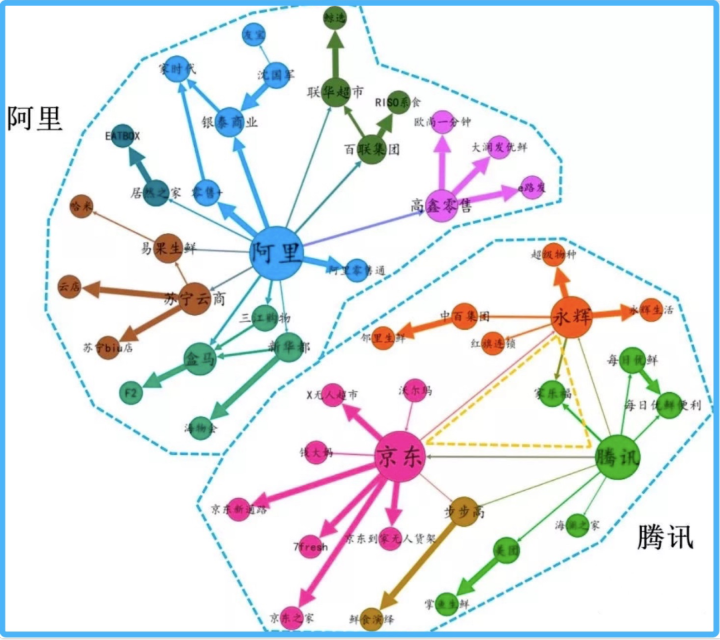 区别在于,阿里的投资仍然是以阿里巴巴为核心,向外层层拓展;腾讯更像是在画同心圆,形成了腾讯、京东、永辉多中心格局,以局部“团战”方式迎敌,即以资本关系为纽带,串联起产业链上下游企业,各方通力合作、共同发展。