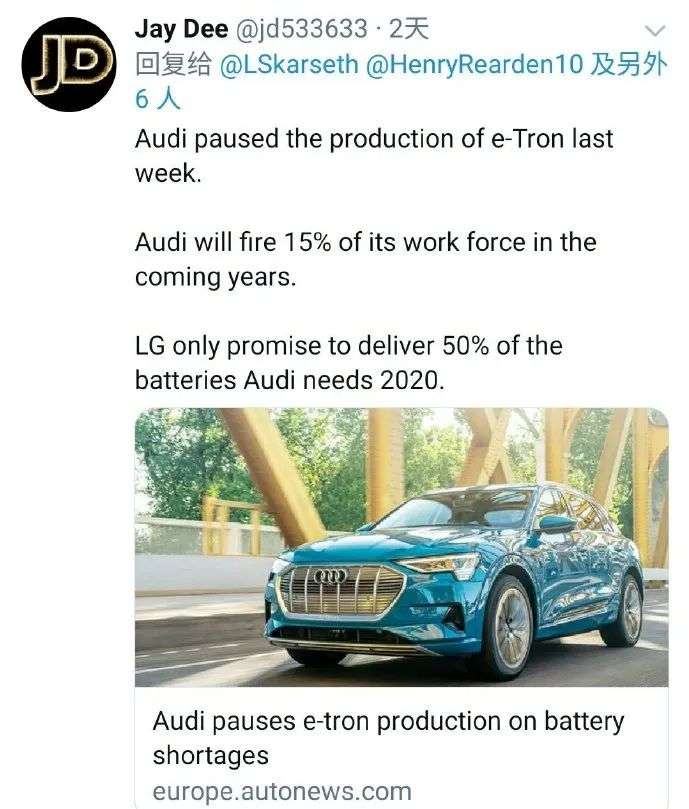 图 | 因为LG供货不足,奥迪e-tron遭遇停产