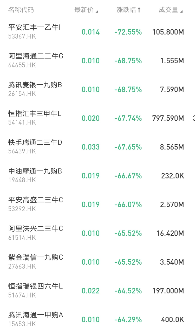 在今日跌幅榜中, $53367.HK 平安汇丰一乙牛I跌72.55%;$64655.HK 阿里海通二二牛G跌68.75%。