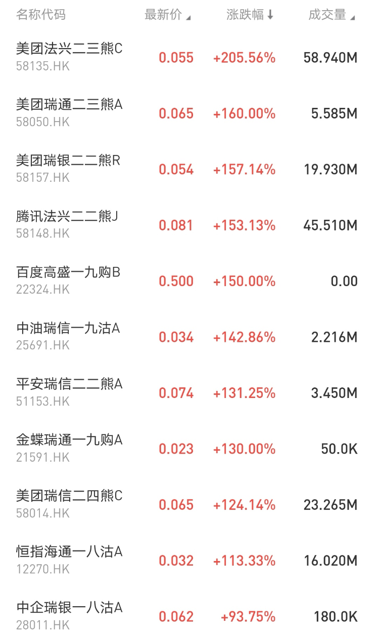 涨幅居前的包括:: $58135.HK 美团法兴二三熊C大涨205.56%,占据排行榜第一; $58050.HK 美团瑞通二三熊A涨160%; $58148.HK 腾讯法兴二二熊J涨153.13%。
