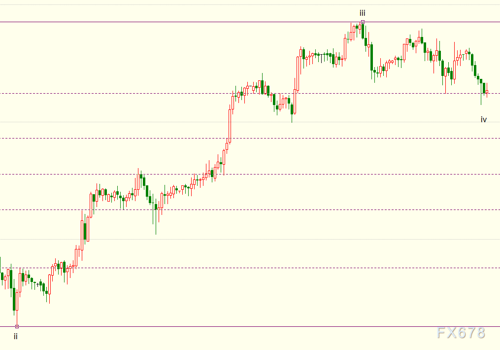 小时图上看,金价自处于自1796美元开启的下行iv浪,触及始于1718美元的iii浪的23.6%斐波那契回档位1777美元,后市或进一步下探38.2%斐波那契回档位1766美元。iii浪和iv浪都是自1680美元开启的上行(i)浪的子浪,(i)浪是同样自1680美元开启的上行((i))浪的子浪。