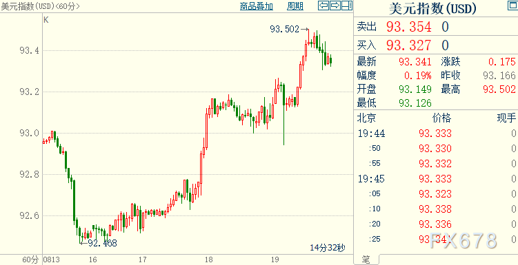 北京时间19:44,现货黄金下沉0.01%至1787.31美元/盎司;COMEX期金主力合约上涨0.31%至1789.9美元/盎司;美元指数上涨0.17%至93.333。