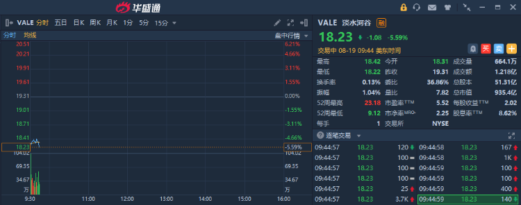 华盛资讯8月19日讯,美股盘初,美股市场铁矿石三巨头股价集体下跌。其中,淡水河谷(VALE)跌超5%,必和必拓(BBL)跌近3%,力拓(RIO)跌超2%。