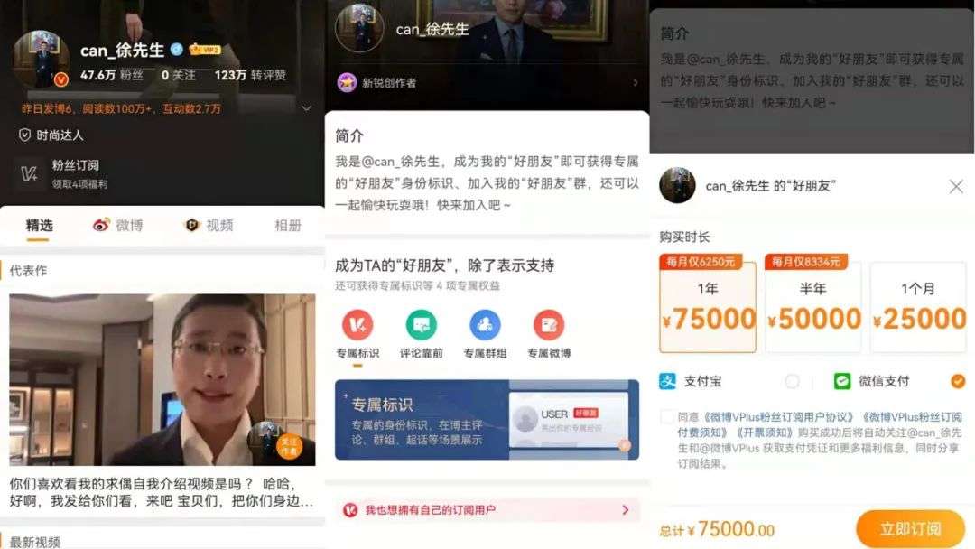更加令人大跌眼镜的是,在微博上粉丝47.6万,被认证为时尚达人的徐勤根明目张胆割起了韭菜。想成为徐先生的粉丝群,需要付费,门槛是2万5一个月,半年5万,包年7万5,如此高的价格让人目瞪口呆。