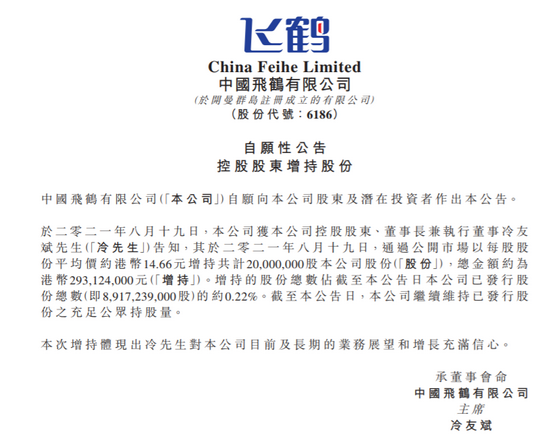 中国飞鹤:公司董事长增持2000万股 涉资2.93亿港元