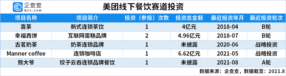 2018年美团参投了喜茶和幸福西饼,旨在挑选头部项目,投资相对谨慎。今年美团出手两次,5月投资 Manner 咖啡,与字节不谋而合。8月美团的身影出现在饺子云吞连锁品牌餐饮熊大爷的A轮投资方名单中,美团开始发力,毫不掩饰对线下餐饮赛道的兴趣,且投资风格从保守趋于大胆。