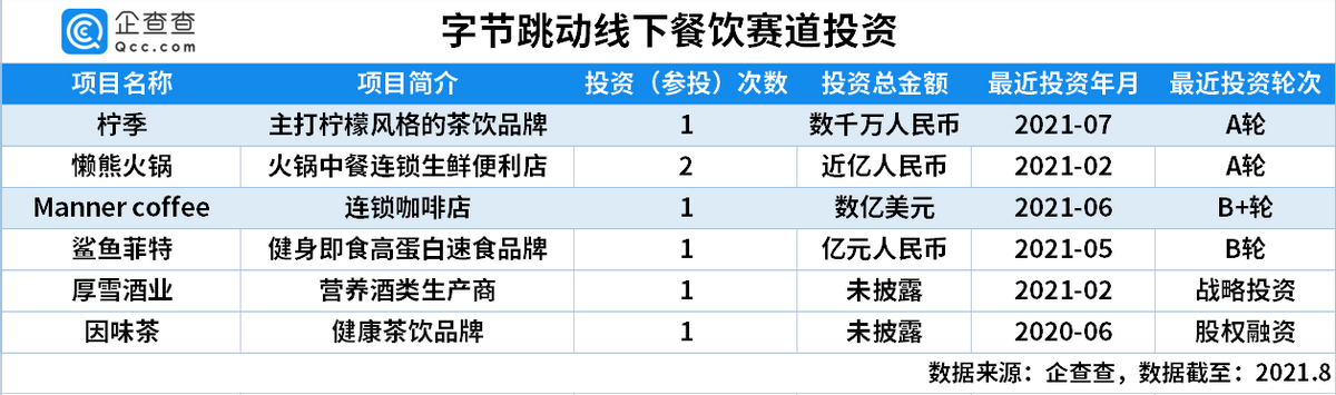 从项目类型来看,字节对新茶饮、新咖啡、新白酒项目均青睐有加,投资了柠季、 Manner咖啡、厚雪酒业、随我小酒等,对火锅食材超市“懒熊火锅”等项目有所偏好。