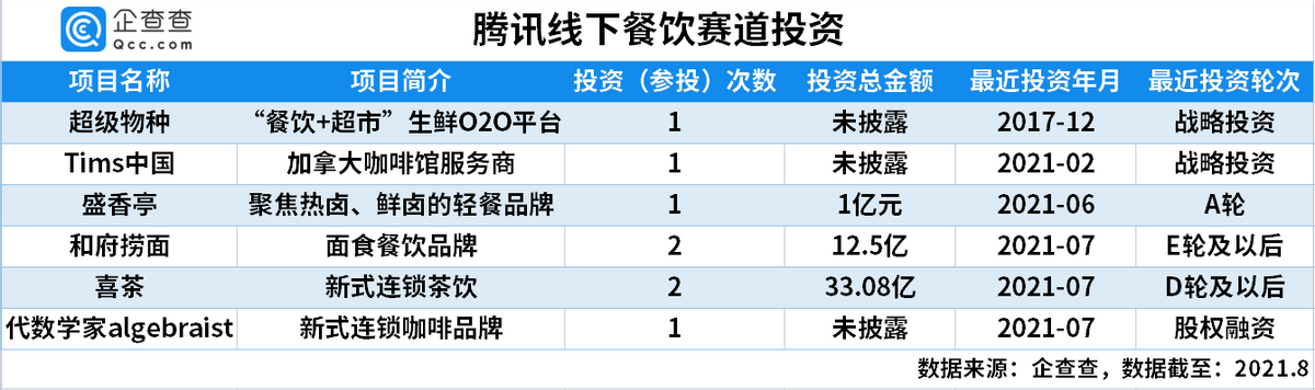从细分领域来看,企查查数据显示,腾讯在新式茶饮方面的投资热情较高,今年七月参投喜茶,总金额达33.08亿元;新咖啡项目有“Tims中国”以及“代数学家algebraist”;此外,连锁面食品牌“和府捞面”以及热卤轻餐品牌“盛香亭”也获得了过亿融资。