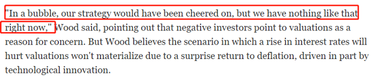 Wood周四表示,她并不认为股市处于泡沫中,并为她以创新为重点的投资策略进行了辩护,并提到了对投资中国资产的看法。