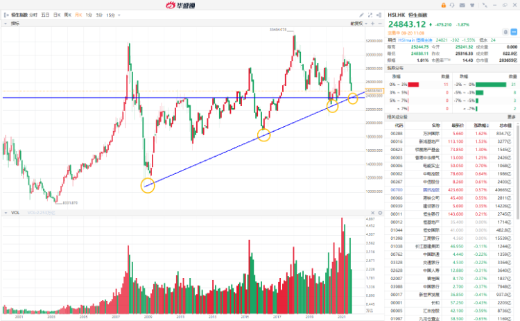 8月20日,恒生指数继续插水跌破25000点,不过从长期趋势来看,恒生指数依然处于上行状态,而这个位置或提供强有力的支撑。