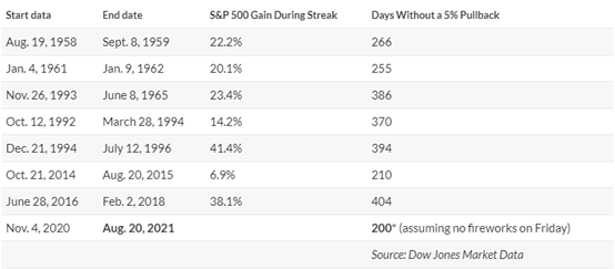 当市场经历404个交易日从高点到低点的跌幅不超过5%时,这种市场如此繁荣的情况就及其罕见了。回顾一下历史发现,标普500指数只有8次在如此长时间内没有出现5%以上的大回调。