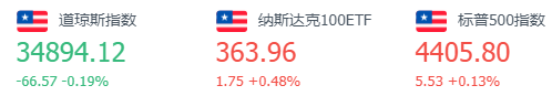 道指跌66.57点,或0.19%,报34894.12点;纳指涨15.87点,或0.11%,报14541.79点;标普500指数涨5.53点,或0.13%,报4405.80点。