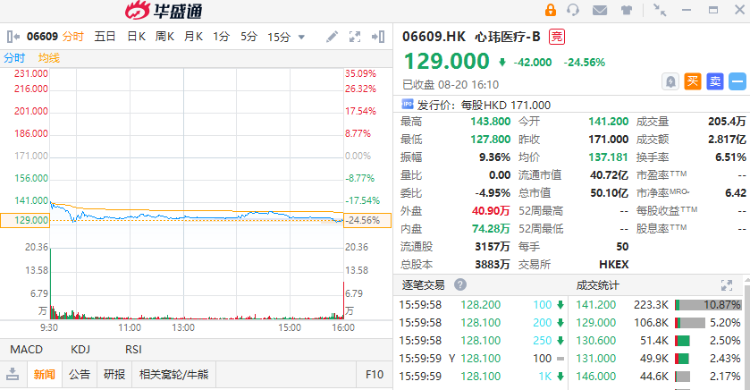 华盛资讯8月20日讯,神经介入医疗器械企业心玮医疗-B(06609.HK)首挂收跌24.56%,报141.20港元,一手账面亏损2100港元,全日成交额2.817亿港元,最新总市值为50.10亿港元。