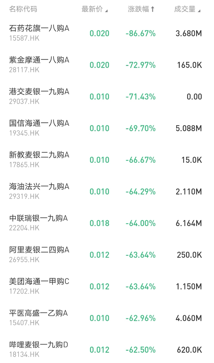 在今日跌幅榜中, $15587.HK 石药花旗一八购A跌86.67%; $28117.HK 紫金摩通一八购A跌72.97%。