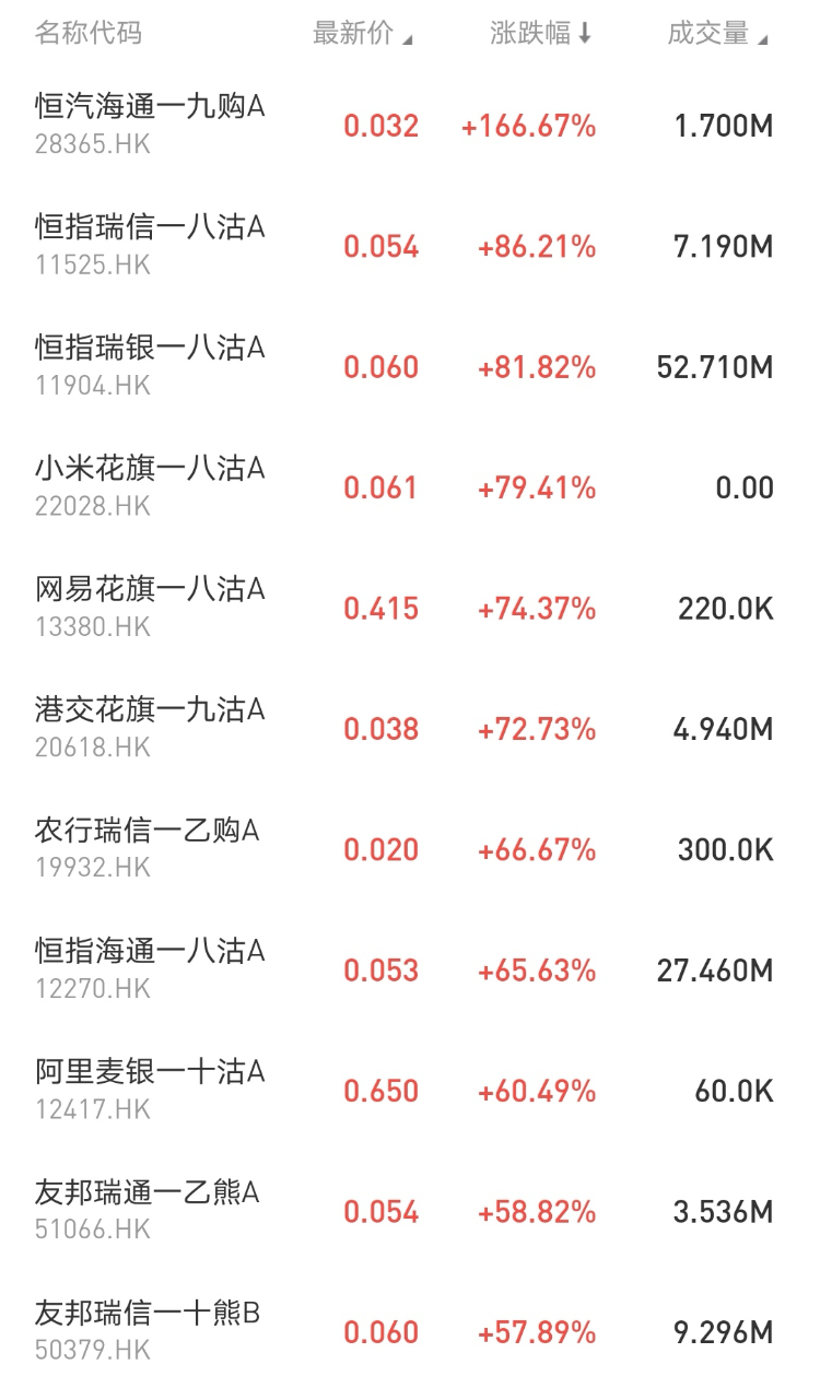 涨幅居前的包括:: $28365.HK 恒汽海通一九购A大涨166.67%,占据排行榜第一; $11525.HK 恒指瑞信一八沽A涨86.21%; $22028.HK 小米花旗一八沽A涨79.41%。