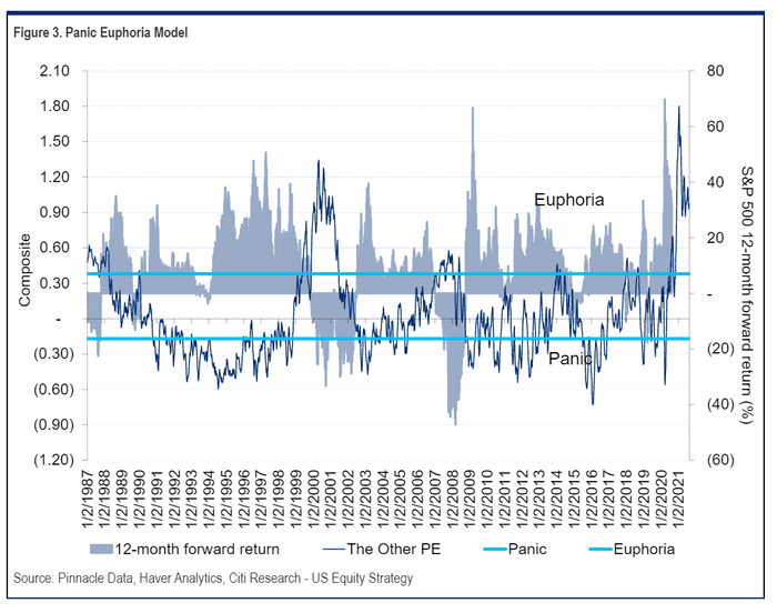 “ VIX恐慌指数仍处于非常高的水平,这也警告未来会有大跌的可能,”花旗分析师在最新的研报中表示:“目前市场处于自1999至2000年以来,狂热情绪持续时间最长且未出现大幅回调的时期。