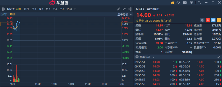 华盛资讯8月20日讯,美股盘初,区块链概念板块普涨。比特数字(BTBT)涨超7%,第九城市(NCTY)涨超8%,嘉楠科技(CAN)涨超8%,比特矿业(BTCM)涨超6%,Riot Blockchain(RIOT)、Marathon Patent(MARA)涨超5%,Coinbase(COIN)涨超3%。