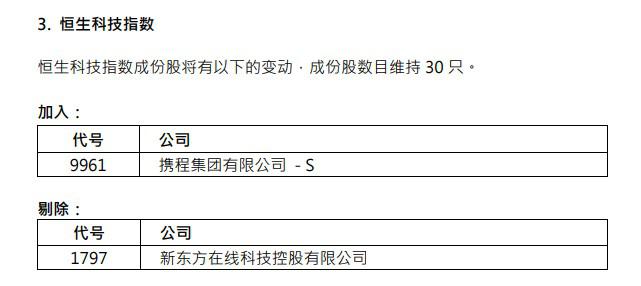 携程集团-S(09961)将被纳入恒生科技指数成分股,新东方在线(01797)将被剔除。成份股数目维持30 只。