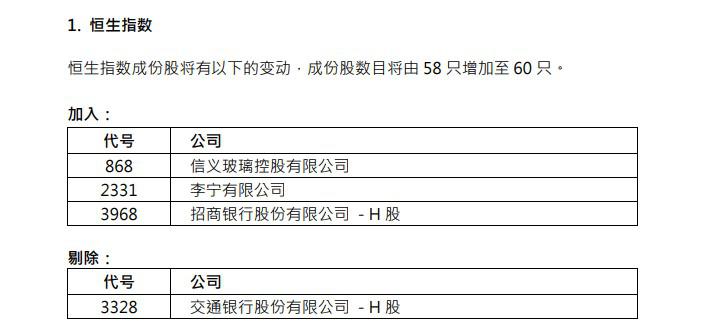 信义玻璃(00868)、李宁(02331)、招商银行(03968)将被纳入恒生指数成份股。交通银行(03328)将被剔除。成份股数目将由58只增加至60只。