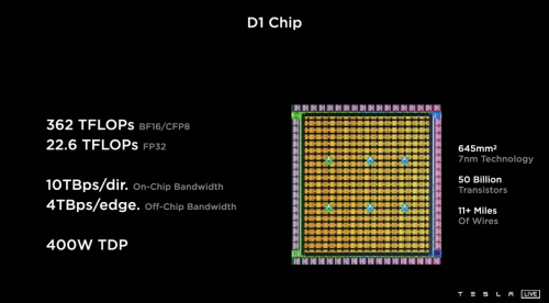 组成Dojo超级计算机的关键单元,是特斯拉自主研发的神经网络训练芯片——D1芯片。D1芯片采用分布式结构和7纳米工艺,搭载500亿个晶体管、354个训练节点,仅内部的电路就长达17.7公里,实现了超强算力和超高带宽。