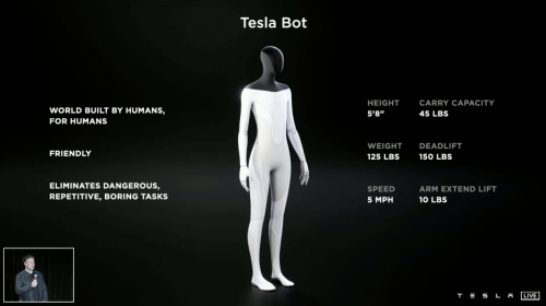 除了备受期待的神经网络学习与Dojo超级计算机,在活动末尾,马斯克在谈到AI发展方向时,还出乎所有人意料地抛出了“Tesla Bot”。Tesla Bot高1.72米,重56.6千克,脸上的屏幕可显示信息,拥有人类水平的双手,并有力反馈感应,以实现平衡和敏捷的动作。