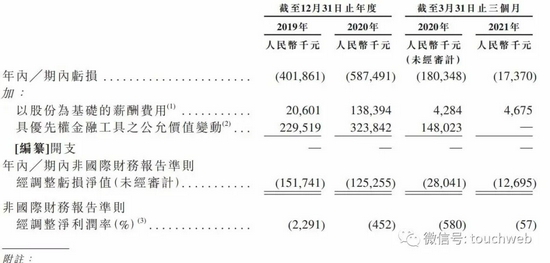 推想医疗2019年、2020年经调整净亏损分别为1.52亿元、1.25亿元;2021年第一季度经调整净亏为1269万,上年同期的经调整净亏损为2804万元。