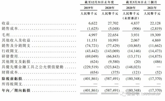推想医疗2019年、2020年期内亏损分别为4.02亿元、5.87亿元;推想医疗2021年第一季度期内亏损为1737万元,上年同期的期内亏损为1.8亿元。