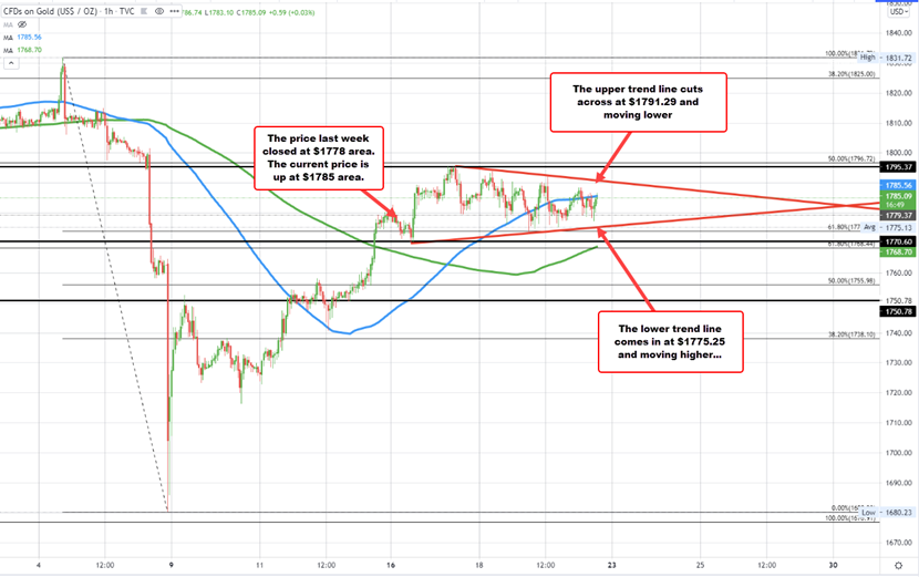 本周五收盘价约为1778美元,位于一个穿过1775.25美元(并继续走高)的上倾趋势线和穿过1791.29美元(并继续走低)的八条下倾趋势线之间。