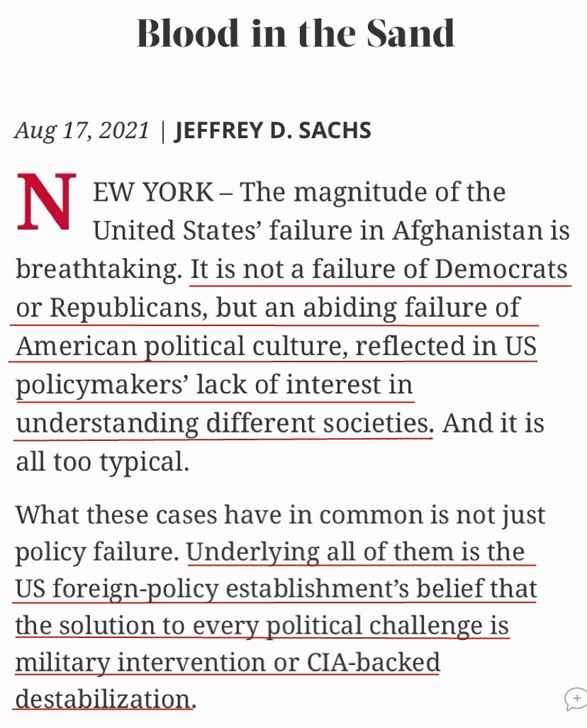 美国知名学者杰弗里·萨克斯日前撰文,批评美国军事干预政策给世界造成严重后果,并指出美国自省意识的缺失令人惊讶。”美国在阿富汗的溃败,是美国政治文化的失败,也是美国热衷于通过军事手段解决政治问题或通过中情局破坏他国稳定的外交理念的失败。”