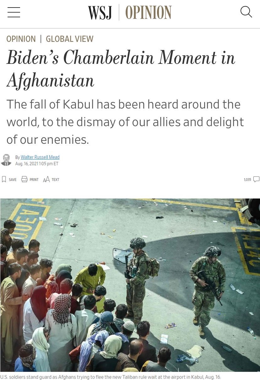 美国哈德逊研究所研究员、纽约巴德学院教授华尔特·拉索尔·米德日前在《华尔街日报》网站发表题为《拜登在阿富汗的张伯伦时刻》的文章,认为拜登政府正面临严重的外交政策危机。与此同时,美国的国际声望也遭到沉重打击。