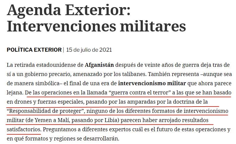 在阿富汗形势剧变前,西班牙《对外政策》双月刊网站就发表了《军事干预行动的未来》一文,深入分析美国持续输出动乱,导致多国局势动荡。