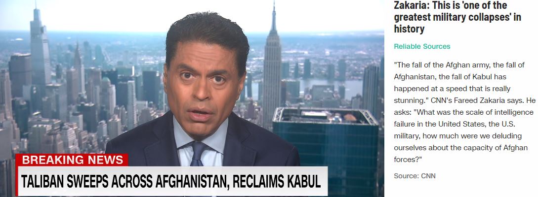美国有线电视新闻网(CNN)主持人法里德·扎卡里亚直言不讳地说:“首先要承认这一点很重要:我认为(美军在阿富汗的表现)是史上最严重的军事溃败之一,这可能也是史上最快的军事溃败之一。”