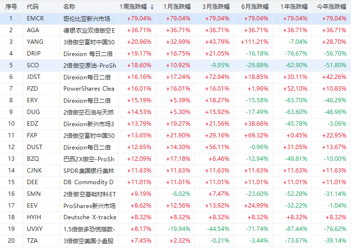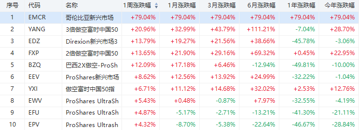 从ETF涨幅榜来看,领涨的主要是做空富时中国ETF。其中,3倍做空富时中国50指数ETF $YANG 一周累计涨20.96%,月累计涨近33%;2倍做空富时中国50指数 $FXP 一周累涨13.65%(AGA/PEK/PZD/CJNK/DEE已退市)。
