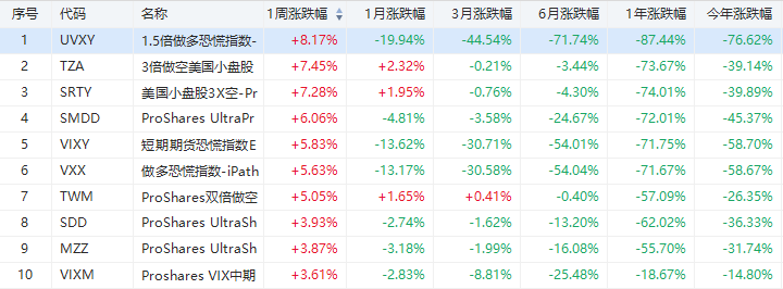 股指方面,本周恐慌指数ETF涨幅居前。其中,1.5倍做多恐慌指数ETF $UVXY 一周累涨8.17%,短期期货恐慌指数ETF $VIXY 周涨5.83%%。