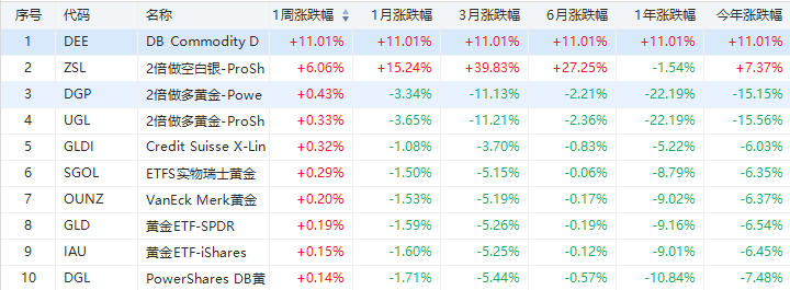 本周白银期货价格累计下跌2.8%,为连续第三周录得跌幅。黄金期货价格本周上涨0.3%,为连续第二周录得涨幅。从ETF涨幅榜来看,做空白银及做多黄金类ETF涨幅居前。