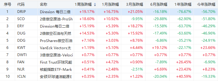 能源ETF方面,做空油气类ETF $DRIP 一周上涨4.32%。国际油价近期“跌跌不休”,疫情扩散引发全球多国出台旅行限制措施,美国经济增速出现放缓迹象,北半球夏季出行高峰接近尾声等因素均持续打压油价。