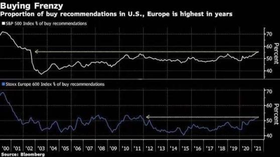 上一次华尔街分析师对股市如此乐观已经是20年前的事了。在标普500指数公司的所有推荐股中,约有56%是买入股,这是2002年以来的最高水平。这显示出在一个轰动一时的财报季之后,席卷市场的狂热程度。