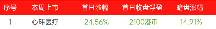神经介入医疗器械企业心玮医疗-B(06609.HK)本周五挂牌港交所,首挂收跌24.56%,报价141.20港元/股,一手浮亏2100港币。