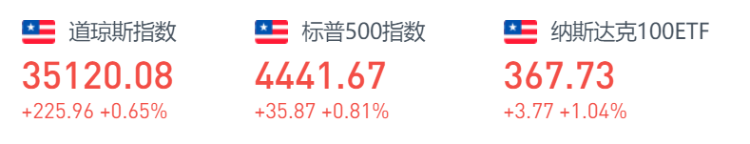 上周五美股收盘,道指震荡走高,收涨0.65%,报35120.08点;纳指涨1.19%,报14714.66点;标普500指数涨0.81%,报4441.67点。