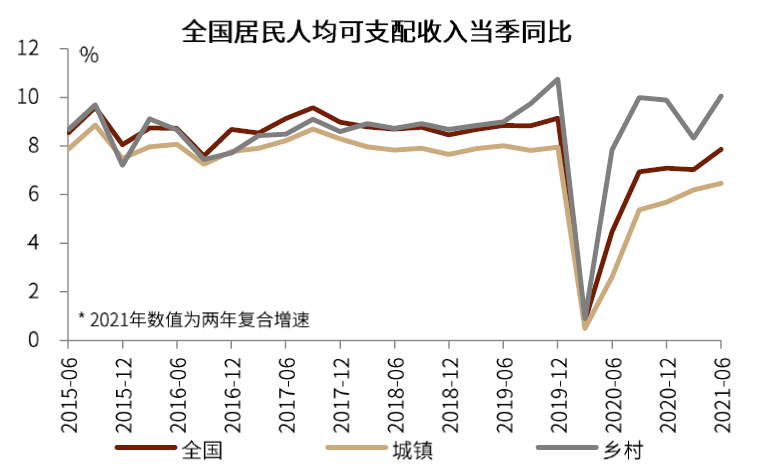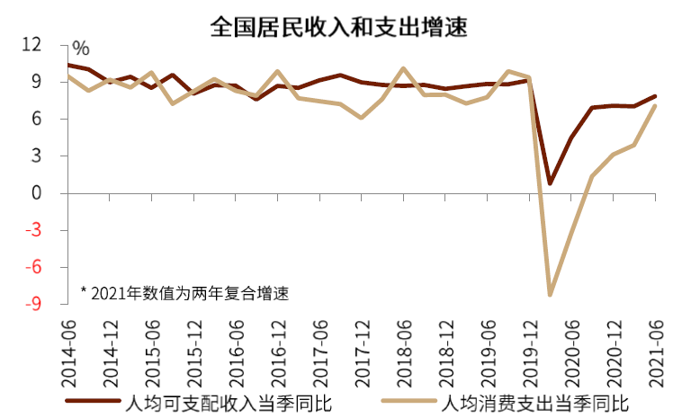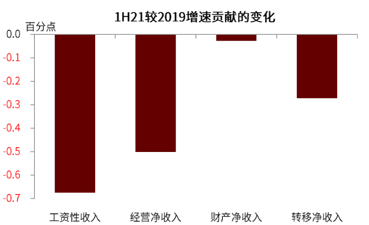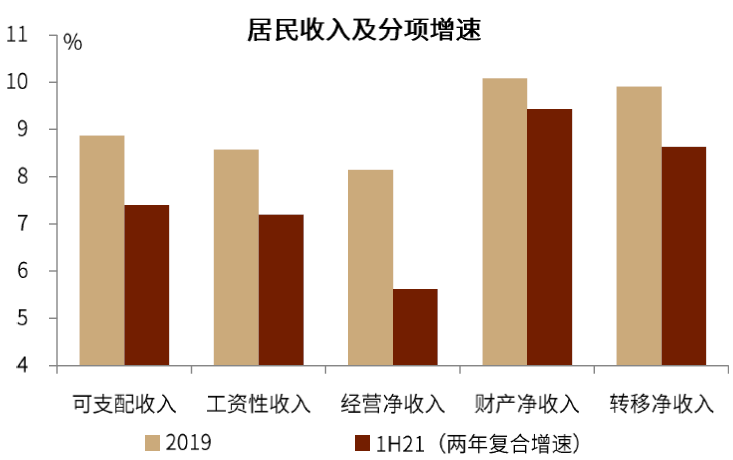 疫情爆发后,线下服务业恢复一直偏慢,可能是压制收入增速的主要原因,而消费意愿亦受到影响。2021年上半年全国居民人均可支配收入两年复合同比增长7.4%,较2019年增速下滑1.5个百分点,各分项收入增速均有回落。