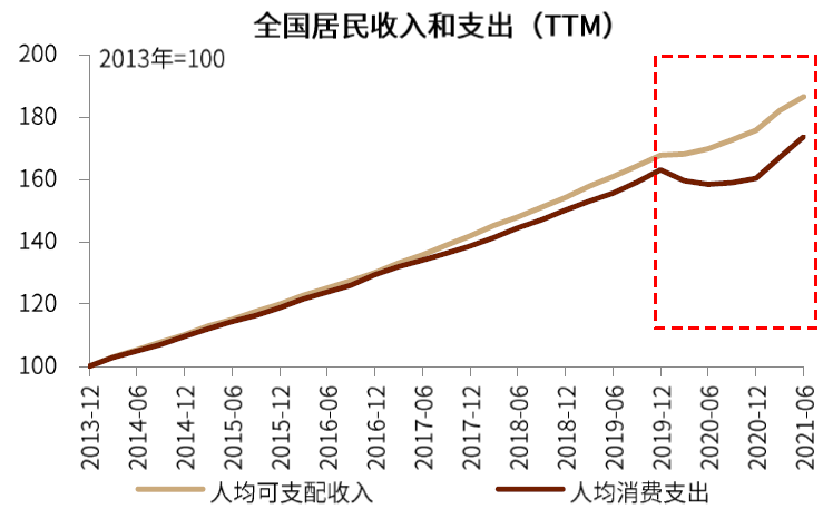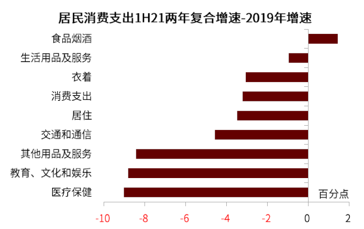 ►可选品和必需品消费分化:2021年上半年,居民主要消费支出项中,食品烟酒为代表的必需品消费支出,两年复合增速达9.5%,比总体消费支出增速高4.1个百分点。而其他各品类支出增速均低于总体,尤其是医疗保健、文教娱乐等,两年复合增速的降幅超过8个百分点。具有可选属性的消费,在疫情扰动下也受到一定抑制。