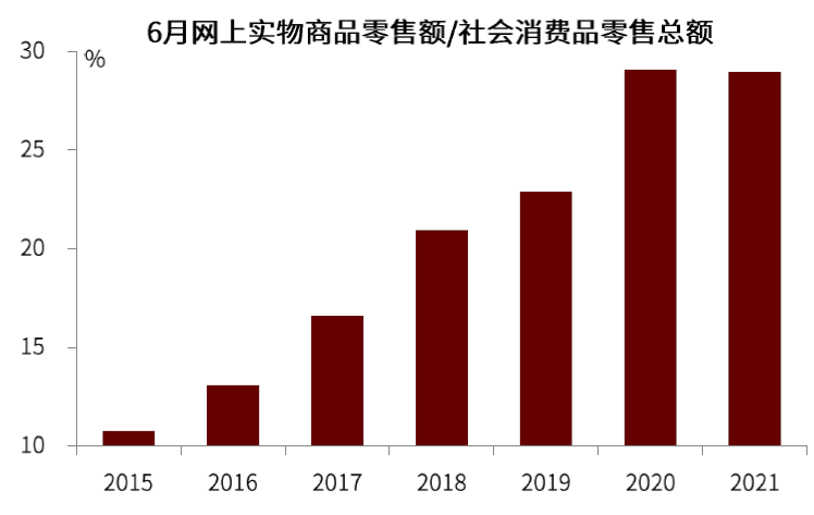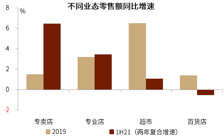 不同业态的消费分化:线上渠道较发达的专卖店、专业店等业态受益,超市和百货等受损。2021年上半年,专卖店、专业店商品零售额两年复合增速为6.5%、3.5%,较2019年分别改善了5和0.3个百分点。对比之下,百货店、超市的商品零售额两年复合增速仅为-0.5%和1.1%,较2019年分别下滑了1.9和5.4个百分点。专卖店、专业店的线上渠道更为发达、网上零售额占比高,疫情后相对受益。