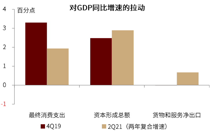 但消费尚未修复到疫情前水平,对经济的拉动也弱于以往。和疫情前(2019年4季度)相比,居民人均消费支出、社会消费品零售总额的两年复合增速分别下滑了2.3和2.8个百分点,仍未达到疫情前的增长中枢水平。从支出法GDP来看,2季度最终消费拉动GDP两年复合增速1.9个百分点,显著低于2019年4季度的3.3个百分点,是经济增速回落的主要拖累项。
