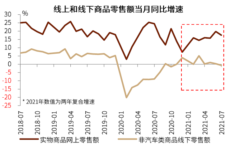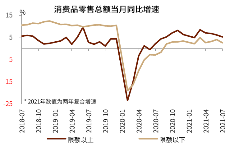 限额以上与限额以下消费分化:2021年1-7月,限额以上企业零售额两年复合增速6.3%,较2019年改善2.4个百分点;限额以下企业零售额两年复合增速仅为3.1%,较2019年大幅下降7.3个百分点。限额以上与限额以下企业消费品零售表现迥异,与商品和服务消费分化、线下消费向线上转移有关。